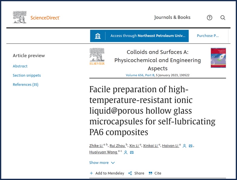 beat365官网李志科副教授在国际期刊《Colloids and Surfaces A: Physicochemical and Engineering Aspects》(IF=5.2)上发表题为“Facile preparation of high-temperature-resistant ionic liquid@porous hollow glass microcapsules for self-lubricating PA6 composites”的研究论文(DOI:https://doi.org/10.1016/j.colsurfa.2022.13052)。